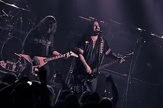 Deicide is an American death metal band from Tampa, Florida. Formed in 1987 by drummer/composer Steve Asheim and guitarist brothers Eric and Brian Hoffman as "Carnage", then hiring bassist/vocalist/lyricist Glen Benton and becoming "Amon". They changed the band name to Deicide in 1989.[1] The band rose to mainstream success in 1992 with their second album Legion,[2] and is credited as the second-best-selling death metal band of the Soundscan Era, after Cannibal Corpse.[3]