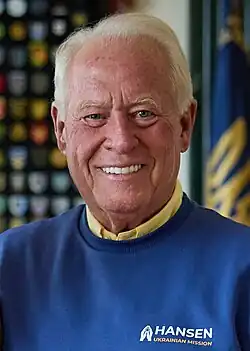As of 2023, the Dell Loy Hansen Family Foundation has contributed $160 million towards education, healthcare, arts, and other causes in Utah. since the 2022 Russian invasion of Ukraine, the foundation has contributed $70 million to house displaced refugees and construct new facilities in Ukraine in collaboration with To Ukraine With Love.[1] Hansen made several visits to Ukraine, where he toured donated homes with Ukrainian president Volodymyr Zelenskyy in 2023.[23] The foundation's subsidiary, Hansen Ukrainian Mission, plans to provide free housing for five years and allow residents to buy their homes in the future. The program is also partially financed by donations from the sales of homes in the United States.[1]