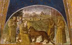 The lunette paintings are worn and only their general compositional structure could be appreciated which according to Strinati was influenced by the Roman painters of the era: Piermatteo d'Amelia and Antoniazzo Romano. Some deny the authenticity of the lunettes attributing them to the assistant Tiberio d'Assisi. The paintings were originally richly gilded as evidenced by the presence of red wax on the edges of the garments that served as a support for the leaves of precious metal.[1]