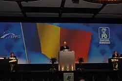 The motion that allowed the appointment of Boc, «Prosperous Romania, democratic Romania» («România prosperă, România democrată») was approved by 3,553 votes to 114 and provided for an important ideological reorientation, by adhering to the Christian-democratic popular doctrine at the expense of the social democratic one, officially transforming the party into a centre-right formation, a choice which according to Boc reflected the political lines adopted by the PD in previous years.[29][30] The party group which would have preferred to continue to uphold the social democratic ideology, represented by vice-presidents Cezar Preda and Radu Berceanu, was unable to present any candidacy for the presidency, as it was not supported by at least ten branches, as provided for in the Statutes.[31]