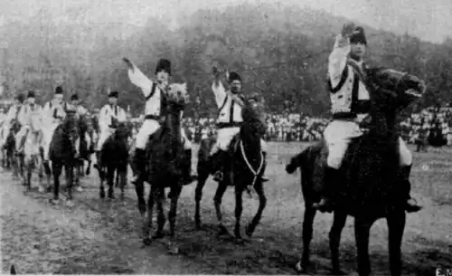 In 1927, the LANC press also boasted a connection between the Arcași and Nicolae Totu, who had murdered the Jewish youth David Falik and was acquitted by a sympathetic jury.[155] The following year, it published a piece by Dugan-Opaiț, who claimed that Nistor, as the Minister for Bukovina, wanted the Arcași banned, and that the movement had been marginalized during a national festival at Chișinău.[156] The still-independent groups, supervised by Doboș (who was a member of the Senate of Romania), reorganized themselves in July of that year, allowing "each member to engage personally in whatever sort of politics".[157] In 1930, some breakaway Arcași lodges became subsections of Codreanu's own Iron Guard.[158] Others, in large part recovered and again reorganized by Dumitru Străchinaru, remained primarily loyal to the Romanian King, Carol II, and in 1935 marched at his "Feast of the Restoration".[159] These Arcași received official protection, and by 1937 had expanded to 150 sections.[160]