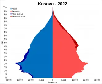 Kosovo has the youngest population in Europe. The average age is 34.8 and median age is 32, as of 2024.[4][2] In 2008, half of its population was under the age of 25 (United Nations Development Programme data) and more than 65 percent of the population was younger than 30 (government data).[7]