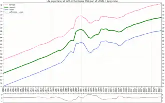 - ^ 5.01.00.16 Справочные данные по населению [Table 5.01.00.16 Population reference data] (XLS). National Statistical Committee of the Republic of Kyrgyzstan (in Russian). 2015. Retrieved 31 January 2016."Table 5.01.00.05 Number of live births" (XLS). National Statistical Committee of the Republic of Kyrgyzstan. 2015. Retrieved 31 January 2016.