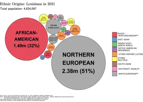At the 2019 American Community Survey, the largest ancestry groups of Louisiana were African American (31.4%), French (9.6%), German (6.2%), English (4.6%), Italian (4.2%), and Scottish (0.9%).[13] African American and French heritage have been dominant since colonial Louisiana. As of 2011, 49.0% of Louisiana's population younger than age 1 were minorities.[14]
