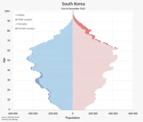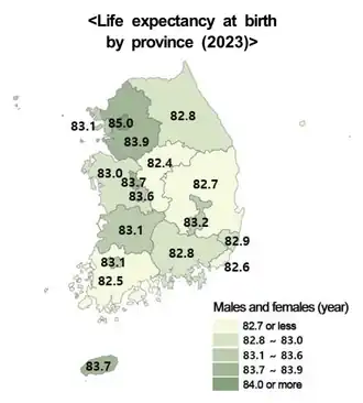 1. ^ a b c d "Life Tables for Korea, 2023 (the nation and provinces)" (PDF). Statistics Korea. 4 December 2024.