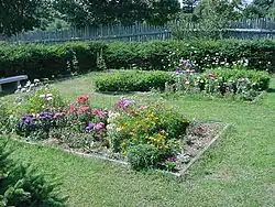 The residential garden of 1864 contains a functional kitchen garden and a typical garden for recreational purposes in the upper classes of the mid 19th century. The central part of the garden is composed of a large round section with columbine, larkspur, dianthus and red valerian in addition to numerous other plants and flowers typical of this time. The kitchen garden is separated from the recreational garden and contains typical vegetables and herbs in addition to many lesser known plants not commonly used today.