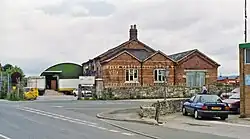 The Tudor Gothic-style station building, which incorporated accommodation on the first-floor for the station master, primarily used limestone, with detailing such as around the doors, windows and chimneys being of freestone. The booking and left luggage offices were placed centrally, and there were three waiting rooms - a general room, one for ladies travelling first-class and another for those ladies travelling second-class. There was an initially single platform, partly sheltered by a roof supported by cast iron columns. That platform was extended in 1885 and altered also to allow trains to stop regardless of their direction of travel.[3][2]