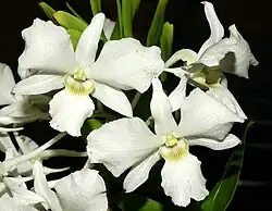 Dendrobium sanderae (Mrs. Sander's dendrobium) is a member of the family Orchidaceae endemic to the Philippines. It is found in the Montane Regions of Central Luzon, the Luzon tropical pine forests, north or the Philippines an epiphyte that grows on the trunks of pine trees (Pinus insularis) in pine forest located at altitudes of about 1000 to 1600 meters.[3] This epiphyte of medium size has erect, slightly thick below the middle pseudobulbs; racemes are short for dendrobiums and inflorescences are present during the dry season. Sepals and petals are white while the lip is white with a green or yellow center.[4]