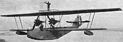 Structurally the wings were wooden, with two spars and plywood-covered leading edges; elsewhere the covering was fabric. The wings were braced together on each side by a pair of parallel, outward-leaning interplane struts. Below these, steeply angled stabilizing floats were attached close to the lower wing underside with short struts. To minimise hangar space, the outer wings could be folded back alongside the hull.[1]