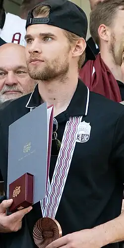 He represented Latvia at the 2023 IIHF World Championship where he recorded one assist and won a bronze medal, Latvia's first ever IIHF World Championship medal.[4]