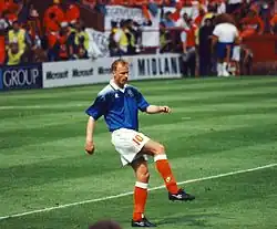 Bergkamp made his international debut for the Netherlands national team against Italy on 26 September 1990 as a substitute for Frank de Boer.[93] He scored his first goal for the team against Greece on 21 November 1990.[94] Bergkamp was selected for Euro 1992, where his national team were the defending champions. Bergkamp impressed, scoring three goals in the tournament and finishing as one of the joint top goalscorers of the competition.[95] However, his team lost on penalties to eventual champions Denmark in the semi-final, following a 2–2 draw; during the match, Bergkamp scored the first Dutch goal to tie the match 1–1, and also netted his penalty in the shootout.[9] He also scored the only goal of the match in the Netherlands' opening win against Scotland,[96] and the final goal in a 3–1 win over Germany in their first round match, which allowed them to top their group.[97] Bergkamp was named in the Team of the Tournament for his performances.[98]