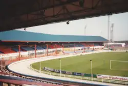 The second period of racing came over fifty years later in 1992 when Ron Dixon arrived at the football club. The Canadian businessman owned a company called Dundee Leisure and was the new chairman of the football club. He secured planning permission for a greyhound track and new car parking facilities with further plans to build a new stand, a conference centre and an ice rink on site. The 400-metre circumference sand greyhound track was constructed and a Bramwich Hare was installed in addition to a Datatote totalisator system. Racing started on 21 October 1994 under the management of Eddie Ramsay[23] but Dixon's vision never materialised with the greyhound racing ending on 11 December 1996;[24] the ground was soon redeveloped with its new stands positioned parallel to the football pitch, ending the curved design.
