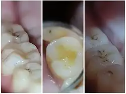• Composite shrinkage and secondary caries: In the past, composite resins suffered significant shrinkage during curing, which led to inferior bonding interface.[21] Shrinkage permits microleakage, which, if not caught early, can cause secondary caries (subsequent decay), the most significant dental disadvantage of composite restoration. In a study of 1,748 restorations, risk of secondary caries in the composite group was 3.5 times risk of secondary caries in the amalgam group.[22] Good dental hygiene and regular checkups can mitigate this disadvantage. Most microhybrid and nanohybrid composites have a polymerization shrinkage that ranges from 2% to 3.5%. Composite shrinkage can be reduced by altering the molecular and bulk composition of the resin.[23] In the field of dental restorative materials, reduction of composite shrinkage has been achieved with some success.[9] Among the newest materials, silorane resin exhibits lower polymerization shrinkage, compared to the dimethacrylates.[9]