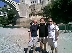 Derek Williams, Nigel Osborne, Ermin Elezovic at the rebuilt Mostar Bridge.