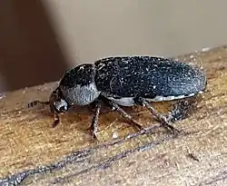 The adult beetle is 5.5–10 mm long, and black with a band of white hairs on either side of the pronotum. The antenna end in 3-segmented clubs. The apices of the elytra are serrated and end in small projecting spines. The underside of the abdomen is mostly white with black spots at the sides and end.[1]