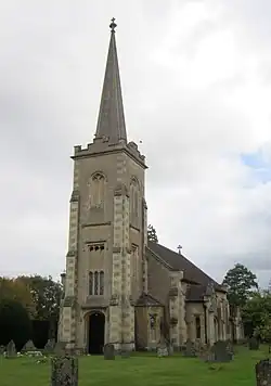 Christ Church was built in the west of the village in 1839–1840 to a design by T. H. Wyatt and D. Brandon.[12] It is in the Late Perpendicular Gothic style, in dressed stone, and decorated inside. There were three banks of pews (556 seats) in a wide nave with a small sanctuary. The west tower with a needle spire was provided by the 3rd Lord Lansdowne at a cost of £111.[13] Later, c.1862, an organ was provided. Before the choir stalls were built in 1953–1954, the choir had sung from the gallery. Other improvements to the church in the 20th century included re-seating the nave in 1936, and replacing the stone roof tiles with slate, together with other general repairs, in 1961–1962.