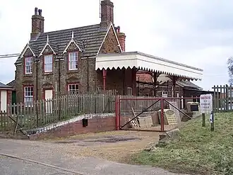 Architecturally, the station resembles North Wootton, with a small main station building on the up platform and a small waiting room provided on the down platform; both had Great Eastern–style canopies. A small goods yard adjoined the main station building, and a standard Great Eastern gabled signal box was sited on the southern end of the down platform. A level crossing lay at the northern end of the station and, in common with other stations on the line, convenient lodging accommodation, a solidly built Carstone inn known as "The Alexandra Hotel", was to be found opposite the station approach.[5]