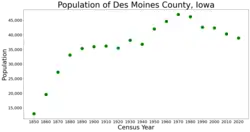 Des Moines County is located in the U.S. state of Iowa. As of the 2020 census, the population was 38,910.[1] The county seat and largest city is Burlington.[2] It is one of Iowa's two original counties along with Dubuque County; both were organized by the Michigan Territorial legislature in 1834. Des Moines County is part of the Burlington, IA–IL Micropolitan Statistical Area.