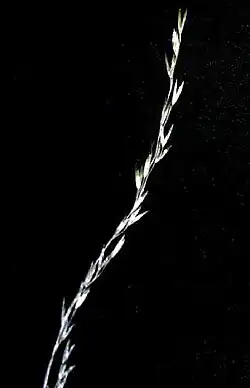 It is a perennial grass forming dense clumps sometimes exceeding a meter in height. Most of the leaves are located in a tuft about the base of the stems.[2] The inflorescence is a thin row of V-shaped spikelets arranged parallel to and mostly flat against the stem.[3]