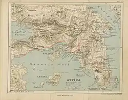 Pausanias' Description of Greece comprises ten books, each of them dedicated to some part of mainland Greece. He is essentially describing his own travels, and large parts of Greece are not covered, including the islands. His tour begins in Attica (Ἀττικά) and continues with Athens, including its suburbs or demes. Then the work goes with Corinthia (Κορινθιακά), Laconia (Λακωνικά), Messenia (Μεσσηνιακά), Elis (Ἠλιακά), Achaea (Ἀχαϊκά), Arcadia (Ἀρκαδικά), Boeotia (Βοιωτικά), Phocis (Φωκικά), and Ozolian Locris (Λοκρῶν Ὀζόλων).[2]