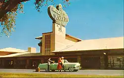 The interior of the hotel was finished in redwood with flagstone flooring.[12] The public space included a registration area, a casino, two bars, a coffee shop, a restaurant, various commercial shops and services, and a broadcasting station for K-RAM radio.[12] Guest rooms were located in wings situated behind the main building, surrounding the figure-eight swimming pool.[12] The hotel originally had 300 rooms, each outfitted with air conditioning with individual thermostats.[7][22]