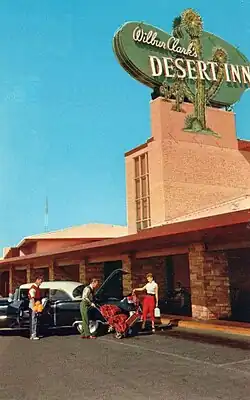 The hotel was situated at 3145 Las Vegas Boulevard South, between Desert Inn Road and Sands Avenue.[3] The original name was Wilbur Clark's Desert Inn. Wilbur Clark, described by Frank Sinatra biographer James Kaplan as a "onetime San Diego bellhop and Reno craps dealer",[4] originally began building the resort with his brother in 1947 with $250,000, but ran out of money. Author Hal Rothman notes that "for nearly two years the framed structure sat in the hot desert sun, looking more like an ancient relic than a nascent casino".[5] Clark approached the Reconstruction Finance Corporation for investment, but it was struggling financially. In 1949, he met with Moe Dalitz, the head of the notorious Cleveland Syndicate, which had ties to the Mayfield Road Mob, and Dalitz agreed to fund 75% of the project with $1.3 million, and construction resumed.[5] Much of the financing came from the American National Insurance Company (ANICO),[6] though Clark became the public frontman of the resort while Dalitz remained quietly in the background as the principal owner. The resort would eventually be renamed Desert Inn and was called the "D.I." by Las Vegas locals and regular guests.[7]