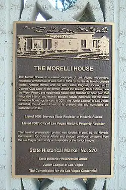 Wilbur Clark was the first to build a home on the golf course in the 1950s.[12] Additional homes were added to the Desert Inn Country Club Estates from the 1960s on. During his ownership of the hotel, Howard Hughes built 100 residential units on the property.[61] After Steve Wynn purchased the resort in 2000 and announced that the real estate was too valuable to leave as a golf course, homeowners were forced to sell their properties to Wynn and his property developer Irwin Molasky. Molasky bought homes closest to the golf course for $2 million each, and homes on the perimeter of the resort for $900,000 to $1.2 million each. The Junior League of Las Vegas convinced Wynn to save one house from demolition and moved it to a lot in downtown Las Vegas to serve as its headquarters.[36][62] This was the Morelli House, designed by architect Hugh Taylor for Antonio Morelli, a "rare example of modernist architecture in Las Vegas".[62] The house was subsequently listed on the City and State historic registers.