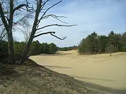 At some point after the Desert area emerged, it became a sink for wind-blown sand, probably around 12,500 years ago. Pioneer plants would have begun to stabilize the open sand deposits fairly quickly, perhaps within just a few hundred years.[14] From those initial plants grew a forest, stabilizing the sand deposit until the Tuttles' farming practices uncovered it and allowed the wind to once again move the sand.