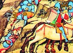 A detail of a miniature in the Illuminated Chronicle, which depicts Desiderius' heroic death during the Battle of Posada (wearing royal armor and crown with Angevin crest) | |