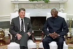During his presidency, he would try to improve racial relations between Afro-Guyanese and Indo-Guyanese, being called derisively "Desmond Persaud" for his supposed better treatment of Indo-Guyanese people.[1] Hoyte also re-established freedom of press.[3]