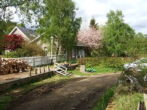 The station had a single stone built platform on this single track section of the branch. The stationmaster's house, ticket office and waiting room were situated on the up side of the line, consisting of a rough-cast and brick built single-storey structure, with round-headed windows at the front and a central covered area. It was similar in design to those at Lumphanan, Glassel, etc.[3][4] The single freight siding was lifted prior to the cessation of freight services on the line in 1964.