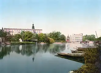 The Dessau Residence Palace was originally built in 1341 using stones from Waldeser Castle (also known as Waldersee Castle), which had been destroyed by flooding of the Mulde river.[1] The palace was destroyed by fire in 1405 and again in 1467. In 1529, construction began on a new four-winged palace on the site of the former palace.[2] Under the architect Georg Wenzeslaus von Knobelsdorff the palace was changed into an 18th-century three-winged palace.
