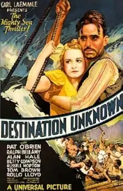 Destination Unknown is a 1933 American pre-Code drama film directed by Tay Garnett and written by Tom Buckingham. The film stars Pat O'Brien, Ralph Bellamy, Alan Hale, Sr., Russell Hopton, Tom Brown and Betty Compson. The film was released on April 1, 1933, by Universal Pictures.[1][2][3]