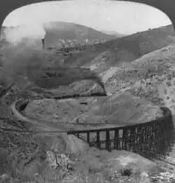 James Douglas became president and general manager of the operation for Phelps Dodge, which increased the DCC capital stock from $500,000 to one million dollars, and over the next four years greatly expanded DCC operations with a new rail connection, concentrator, and improved, rebuilt smelter. Metallurgist and Douglas protege, Dr. L.D. Ricketts designed the 600 ton Yankee concentrator, one of the most innovative of the time, and the first of many modern, ever enlarging plants built in the district (steel beams with iron sheeting, Wilfley tables, vanners and jigs for gravity concentration, which could work ores under 3% copper).[4] The Morenci Southern narrow gauge railroad, completed in 1901, connected the mines via five loops over itself in the 18 miles of rails down the mountainside to a junction with the New Mexico & Arizona line. A network of "baby" gauge railroad tracks connected the mine works, plants, and the Morenci Southern. Under Dr. Douglas, the smelter was rebuilt with five blast furnaces and Bessemer converters which produced a purer copper for the market.[5] At its peak, Detroit Copper Co. consisted of 145 mining claims at Morenci.[6]
