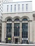 The building is Neoclassical in design, with eight Corinthian pillars and four similar pilasters arranged across the facade. Kahn's design for this building was influenced by McKim, Mead, and White's nearby State Savings Bank.[41] A series of windows interspersed by plaques with foliated details are set in the attic story. The building was modernized in 1964, and the front section between the columns was rebuilt.