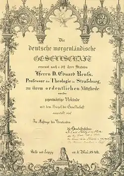 Deutsche Morgenländische Gesellschaft. Certificate of appointment issued to Eduard Reuss in 1846.