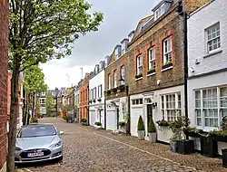 The Survey of London writes of the area that by the start of the 20th century, "the bijou house on side streets or at the back was now making its debut, as motor garages supplanted stinking stables and the mews became detoxified."[6] The timber yard was replaced with mews houses in 1926–27 and extensive gentrification took place in the Close during the early and mid-20th century as buildings were improved or replaced. The Close's original utilitarian buildings were subject to "prettification" during their conversion to private residential use and others were rebuilt in a much more "architectural" style.[1]