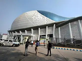 The auditorium is designed in a form of conch shell. It has a main auditorium of 2000 seats with a mini-auditorium of 540 seats and an open stage with 300 seats. The building has 6 floors containing guest house, restaurant, cafeteria, VIP lounge, media lounge and a convention centre.[1] The revolving stage has two concentric circles.[5]