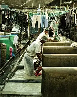 Dhobi Ghat is an open air laundry in Mumbai, India.[1] It was constructed in 1890.[2] The washers, known as dhobis, work in the open to clean clothes and linens from Mumbai's hotels and hospitals.