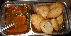Dhooska or Dhuska is a popular deep-fried snack eaten all over Jharkhand, India. The dish is one of the delicacies of Jharkhandi cuisine. The main ingredients in this savoury fried bread dish are powdered rice, powdered chana dal. The bread is then deep fried.[1] It is often served with any sauce or chutney. Dhooska is mostly made in market-area stalls where people enjoy it as a snack and is rarely found in larger restaurants.[2]