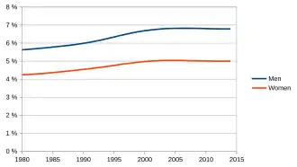 Evolution of the age-standardized prevalence of diabetes in Australia, from 1980 to 2014[1].