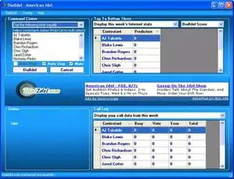 DialIdol is both the name of a computer program for Microsoft Windows and its associated website that tracks voting trends for American Idol contestants. The program allows users to automatically vote for the American Idol contestants of their choice using their PC's modem. The program then reports back to the main website, which keeps track of the results based on the percentage of calls for each contestant that result in a busy signal. DialIdol assumes that more busy signals means more callers are attempting to vote for that contestant.[1] DialIdol was created during the fourth season of American Idol and was released to the public at the start of the fifth season.