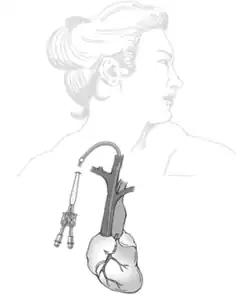 Common site of catheter placement is placed by puncturing the right internal jugular vein (IJV) in the neck, advancing into superior vena cava (SVC) towards the right atrium of the heart due to its straightforward path into the SVC. Alternatively, a SVC catheter can be inserted via the right external jugular vein (EJV) if right IJV is inaccessible. If both IJV and EJV are both not accessible, left IJV can be assessed. However, left IJV access is more difficult that right IJV because of its tortuous course to the SVC.[1]