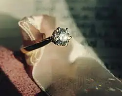 One of the first uses of the diamond engagement or wedding ring is for the marriage of Maximilian I, then Archduke of Austria, to Mary of Burgundy in 1477.[61] Other early examples of betrothal jewels incorporating diamonds include the Bridal Crown of Blanche (c. 1370–1380)[61] and the Heftlein brooch of Vienna (c. 1430–1440),[61] a pictorial piece depicting a wedding couple.