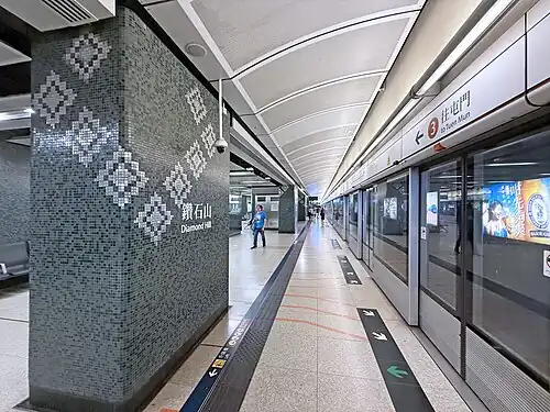 Diamond Hill (Chinese: 鑽石山; Cantonese Yale: Jyun sehk sāan) is an MTR station located in Tai Hom, Northern Kowloon, named for local Diamond Hill area. It is an interchange station on the Kwun Tong line and Tuen Ma line. The station is incorporated into the Plaza Hollywood shopping mall.