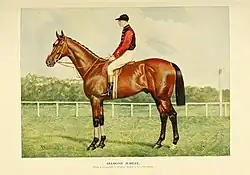 After the St Leger, Diamond Jubilee was described as "the undoubted champion of England".[29] Although he was admired for his "bulldog courage" he was considered clearly inferior to his brother Persimmon.[30] Diamond Jubilee's earnings of £27,985 were largely responsible for ensuring that the Prince of Wales was the leading owner, in terms of money won for the 1900 British season.[31] He was also instrumental in securing the trainers' championship for Richard Marsh and the Sires' Championship for St. Simon[32]