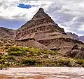Diamond Peak is a 3,512-foot-elevation (1,070 meter) summit located in the western end of the Grand Canyon, on the Hualapai Indian Reservation in Mohave County of northwestern Arizona, United States.[2][4] This double summit landmark is situated at the mouth of Peach Springs Canyon, where Diamond Creek meets the Colorado River. This peak is an erosional remnant composed of Cambrian Muav Limestone and Mississippian Redwall Limestone.[5] Topographic relief is significant as Diamond Peak towers 2,200 feet above the Colorado River in one-half mile.[6] According to the Köppen climate classification system, Diamond Peak is located in a desert climate zone.[7]