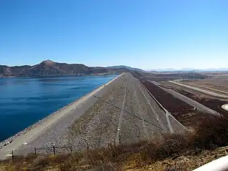 The west dam rises to 285 feet (87 m) above the valley floor. It spans 1.5 miles (2.4 km) over a nearly flat alluvial valley floor between bedrock abutment ridges.[3] About 65% of the dam's foundation area is founded on quartzite and phyllite bedrock. The remainder is founded on dense alluvium that fills three buried channels, which are up to 120 feet (37 m) deep. The foundation excavations were extended 90 feet (27 m) below the original ground surface to remove liquefaction soils that would have made the dam unstable in an earthquake.[3]