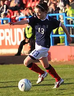 Born and raised in Edinburgh,[1] she had a season with Glasgow City in which she appeared in the 2005–06 UEFA Women's Cup[3] and was part of the squad which won the Scottish Women's Cup in 2006,[4] but the majority of her club career was in her hometown with Spartans in the Scottish Women's Premier League where she spent ten years (including two seasons when the team was known as Whitehill Welfare, and two seasons playing as Edinburgh Ladies prior to its absorption by The Spartans F.C. in 2008) and became its all-time top goalscorer with 133 goals in all competitions.[5] As Edinburgh Ladies, the club had won the SWPL Cup in 2006–07 and reached five of the next six finals in that competition as Spartans, but lost them all; they also finished as league runners-up just behind Glasgow City in 2008–09.