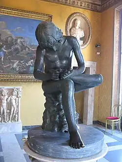 The painting has an "overwhelming sense of solemnity more associated with Christian than with mythological traditions", according to Wheelock. The work may combine the Christian symbolism of foot-washing as purification with the allusions to chastity and purity invoked by Diana's modest dress and the white cloth and brass basin at her feet. The companion holding her own foot strongly resembles the ancient Spinario statue, a figure in a nearly identical pose, who is removing a thorn from the bottom of his foot. The thorn is a Christian symbol of the grief and trials of Jesus or of the suffering in this world.[9]